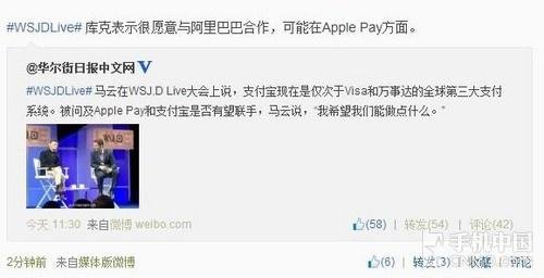 在今日举行的《华尔街日报》全球科技大会上,苹果CEO蒂姆・库克与阿里巴巴集团董事会主席马云均表示了希望与对方合作的意向,并且据最新消息,两位大佬将在本周探讨关于Apple Pay与支付宝合作的问题。